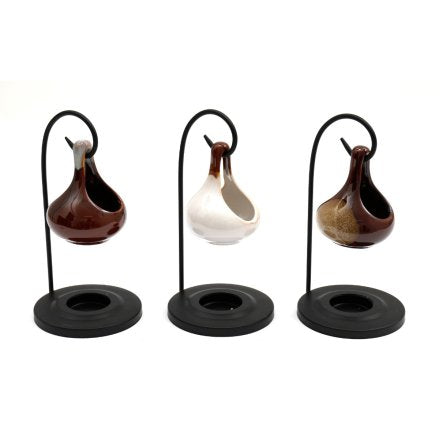 A lovely glazed tealight oil burner or wax warmer suspended from a sleek black arched stand, available in three assorted designs. Simply add your favourite wax melt or essential oil, sit back, and unwind as the soothing aroma fills your space.
